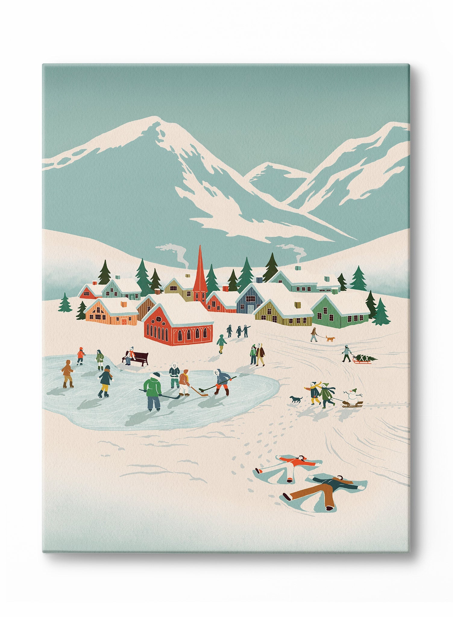 This print captures a lively winter scene, where skaters glide gracefully across a frozen pond, surrounded by a quaint village nestled in a snowy landscape. The backdrop features majestic mountains, their peaks dusted with snow, under a soft, wintry sky. The village, with its charming houses and a striking red church, adds a touch of warmth to the cool surroundings.