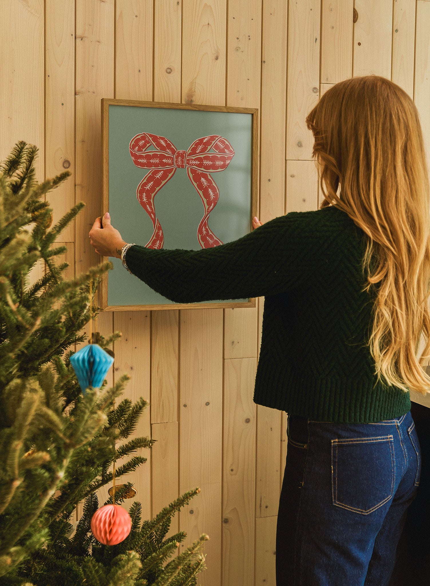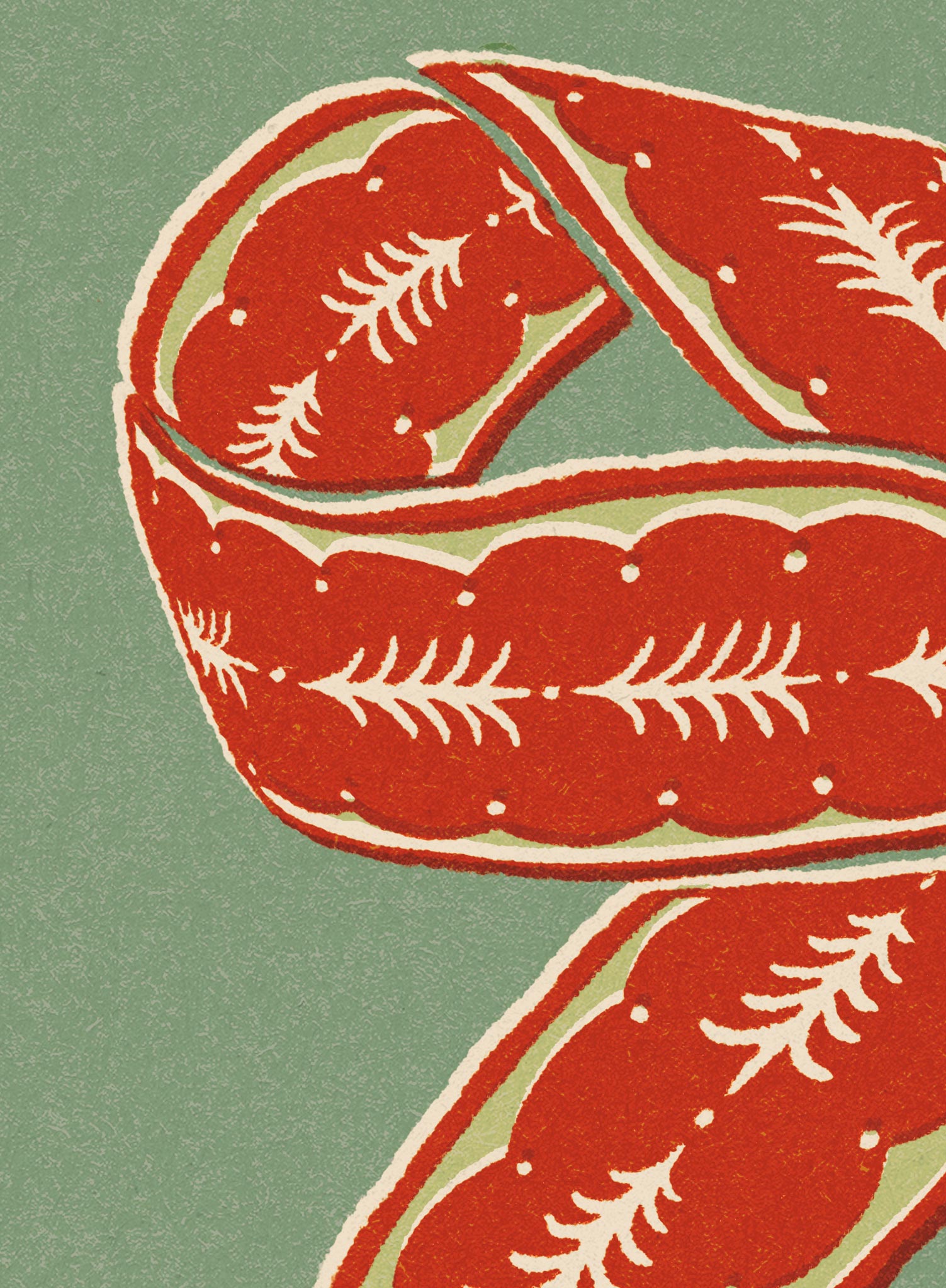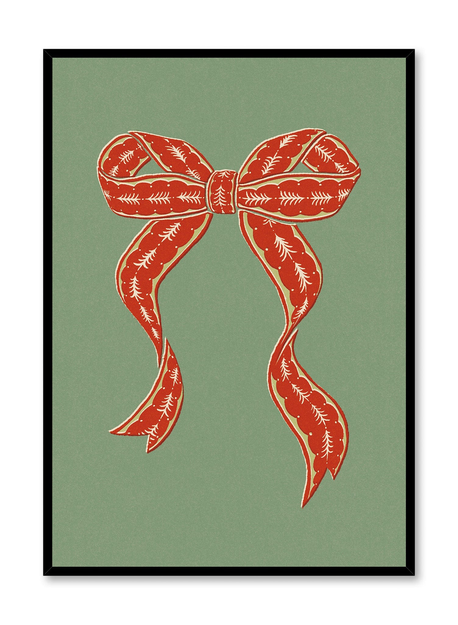 This print features a striking red bow adorned with intricate white patterns, set against a muted green background. The bow's flowing ribbons and detailed design evoke a sense of festive charm, capturing the spirit of holiday traditions with a modern twist.